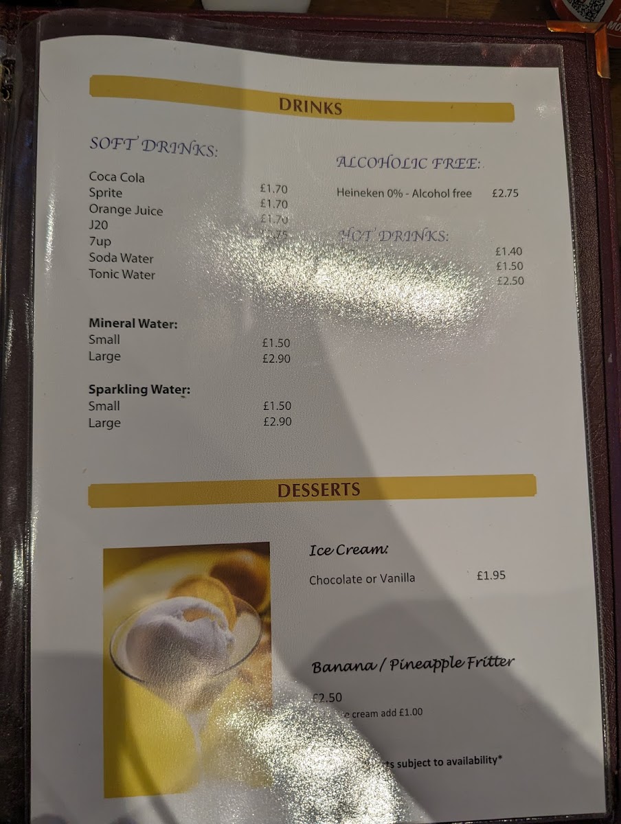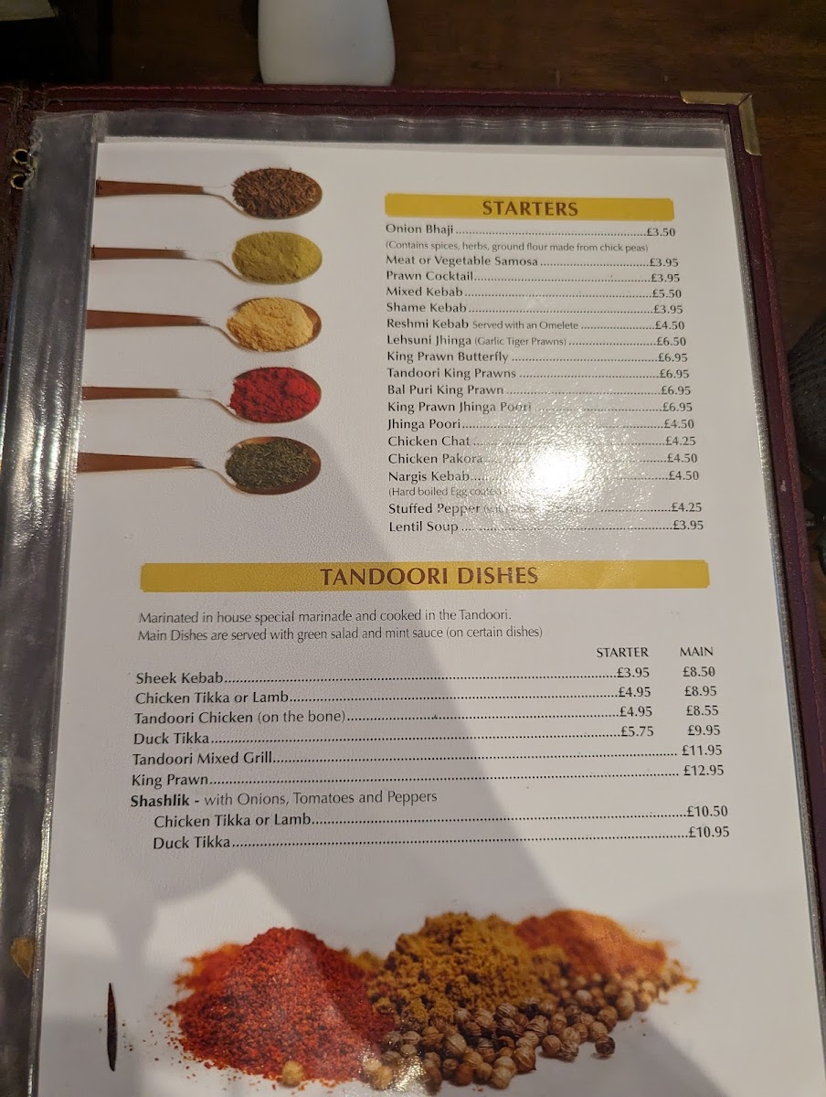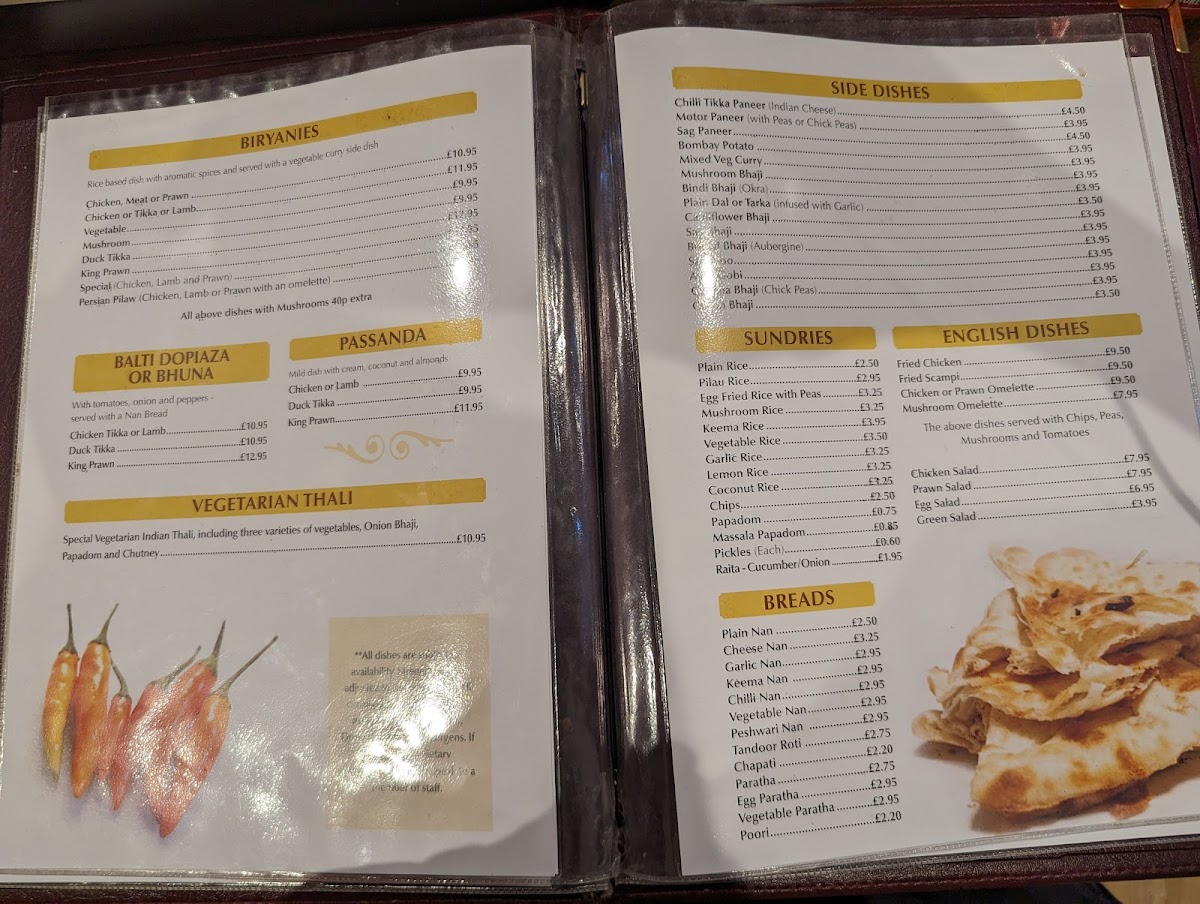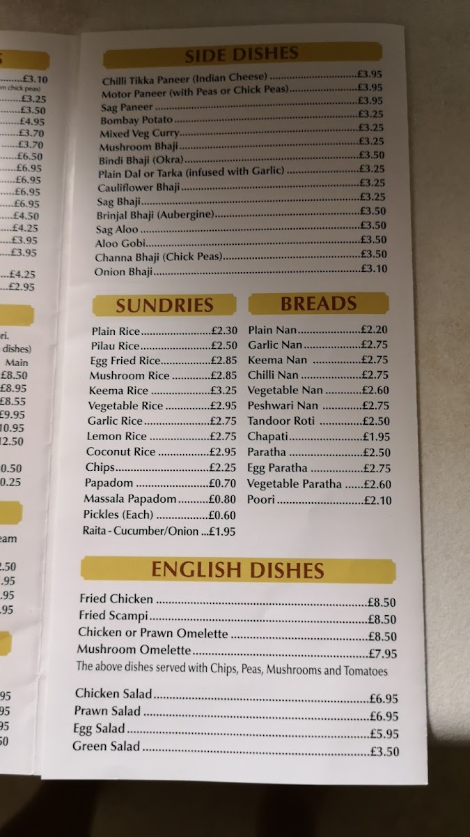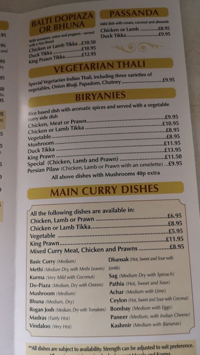 The Biryanis, from Chicken, Meat or Prawn, to King Prawn and Mushroom Duck Tikka, showcase fragrant, layered rice dishes that are hearty and satisfying. Balti, Dopiaza, or Bhuna curries with Chicken Tikka, Duck Tikka, or King Prawn highlight the restaurant’s commitment to flavorful, authentic Indian cooking. Vegetarians can enjoy sides like Chilli Tikka Paneer, Motor Paneer, Sag Paneer, Bombay Potato, and Mixed Veg Curry, complemented by sundries such as Plain Rice, Pilau Rice, Mushroom Rice, and Keema Rice, as well as a wide selection of breads-Plain Nan, Cheese Nan, Garlic Nan, Keema Nan, and Chilli Nan.