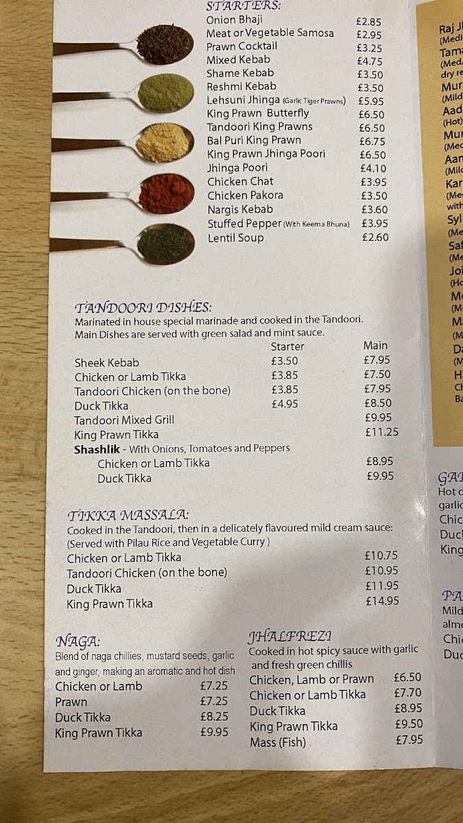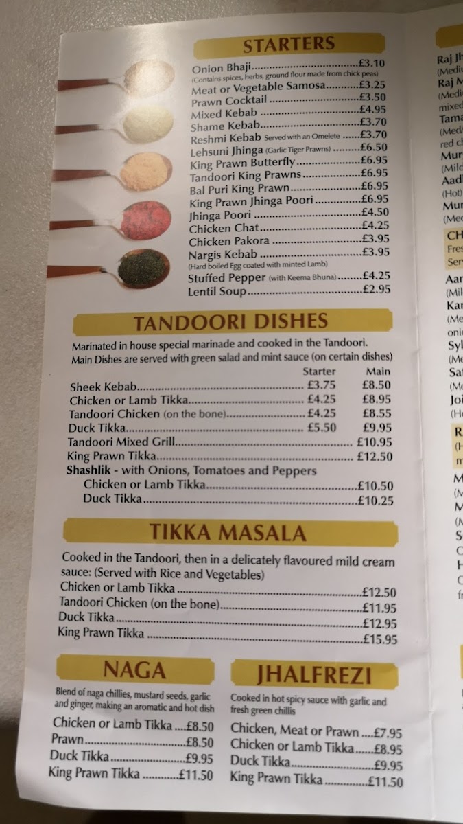 From a reviewer's perspective, the menu at Raj Of India on Shaftesbury Street in Fordingbridge offers a diverse and enticing range of dishes that cater to both traditional Indian cuisine lovers and those seeking lighter or familiar options. The Tandoori Dishes, including Sheek Kebab, Chicken Tikka or Lamb, Tandoori Chicken, Duck Tikka, and the Tandoori Mixed Grill, promise smoky, richly spiced flavors. Starters such as Onion Bhaji, Prawn Cocktail, and the variety of kebabs like Mixed Kebab, Shame Kebab, and Reshmi Kebab provide a satisfying introduction to the meal. For those craving heat, the Naga options-Duck Tikka, King Prawn Tikka, and Chicken Prawn-deliver bold, fiery tastes, while classic Tikka Masala selections of Chicken or Lamb Tikka and Tandoori Chicken appeal to fans of creamy, aromatic sauces. The menu also offers Jhalfrezi with chicken, meat, prawn, or tikka variations, including King Prawn Tikka, adding a touch of robust spiciness.